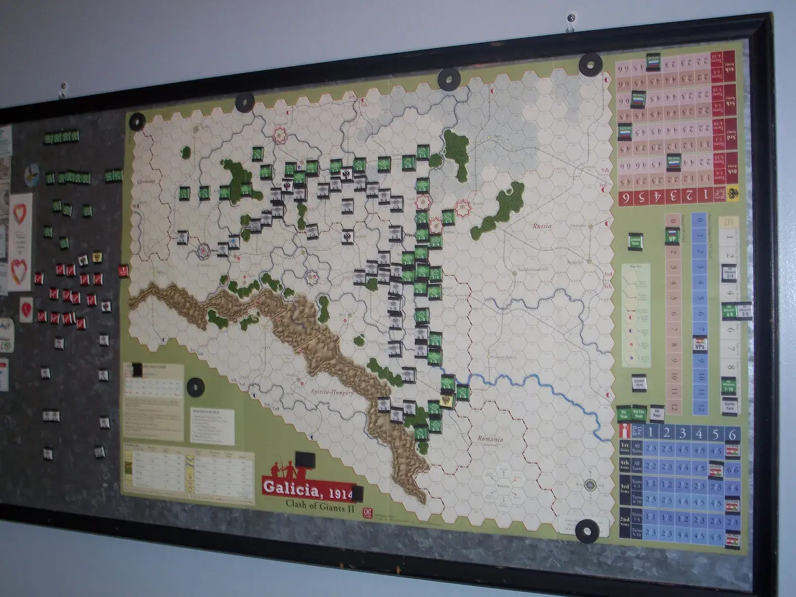 Galicia 1914 includes a corps/division OB and a map scaled at 9 miles to the hex that covers the entire front from Krakow to the Romanian border. The victory conditions force the Austrian player to attack initially in order to gain enough VPs to survive the strong Russian offensive certain to follow. Galicia features special rules for the great Austrian fortress of Przemysl, Russian cavalry replacements, rail supply, Offensive Support Markers (representing heavy artillery and the logistical and command preparations of a major assault), and the arrival of the Austrian 2nd Army.