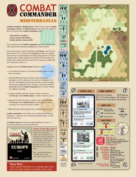 • Combat Commander: Volume II - Mediterranean (or CC:M) is the expansion to Combat Commander: Europe ("CC:E"). CC:M's main theme is the addition of three new "nationalities" to the Combat Commander family: