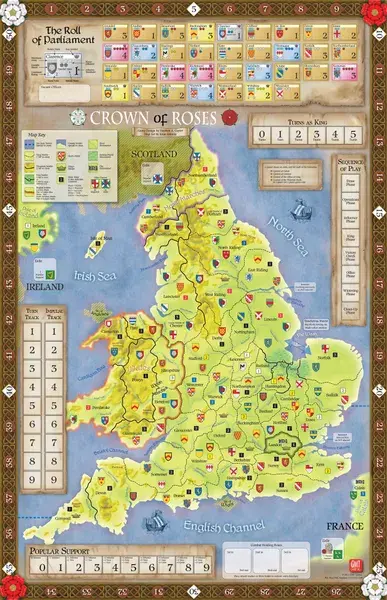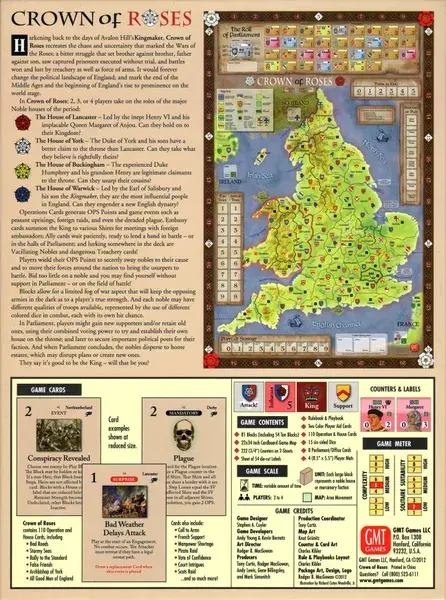 Crown of Roses is a 3-hour block game set during the turbulent years of the Wars of the Roses in 15th Century England. This 35-year long conflict saw the extinction of a large number of noble houses, and would eventually set the house of Tudor upon the throne.