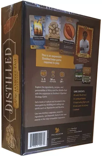 • Explore the ingredients, recipes, and personalities of Africa and the Middle East with this expansion to Distilled: A Spirited Strategy Game. Get a taste of culture not included in the base game by distilling and selling new spirits such as Akpeteshie and Boukha. Use new distillery upgrades, powerful ingredients, and thematic items to win new awards in this fully compatible expansion.