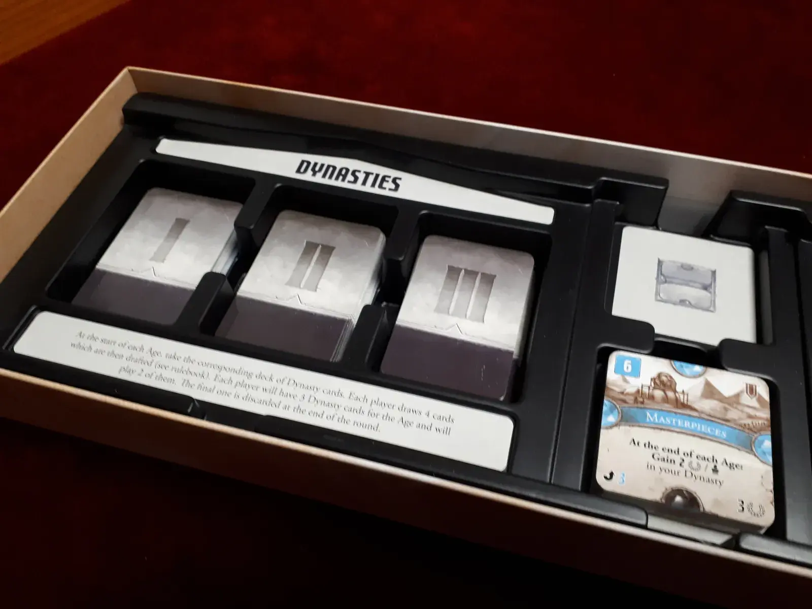 When playing with Dynasties, you’ll be drawing Dynasty cards at the start of each Age and drafting them. There’s a deck of cards for each Age: I, II and III, each with exponentially greater abilities. Each player draws 4 cards and chooses one before passing the remaining cards to the player on their left. They then take the three cards from the player on their right and choose another card to keep. This is repeated one last time so that all players have 3 Dynasty cards in hand. All unused cards are then returned to the box.