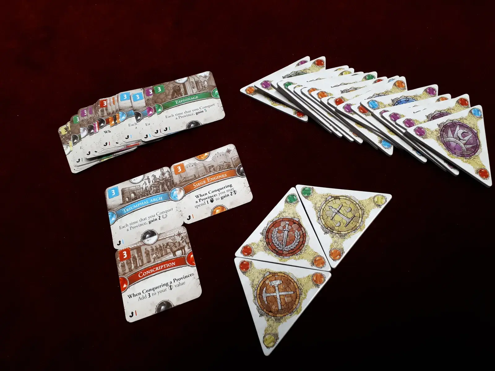 At the beginning of each Age, each player will draw a Province card, then take the corresponding Province tile which will be added to their hand. This tile must be placed on the board during the Age during your Growth phase, at the same time as a regular domino. Each player will hence be playing six dominoes during the Age instead of the usual five. These dominoes will have unique illustrations and characteristics : some will have resources, some will have other effects, much like the Monument tiles.