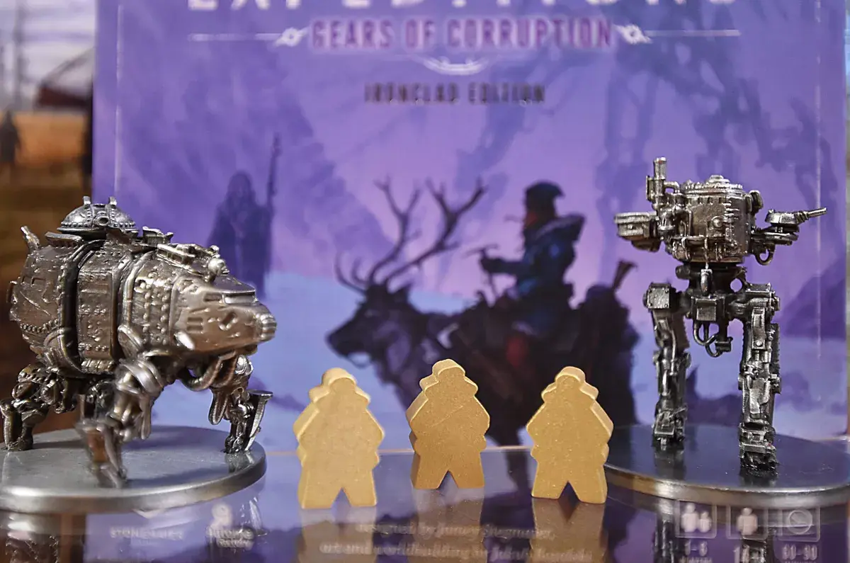 The Gears of Corruption expansion to Expeditions adds elements of risk and danger in the form of secret bonuses on map tokens and a corrupted mech that roams the land. To counter these threats, the expansion offers 2 new mechs and 4 new character/companion pairs, as well as components for a 6th player. Gears of Corruption also accelerates early gameplay by giving players starting resources and a hero worker that can act as any type of worker.