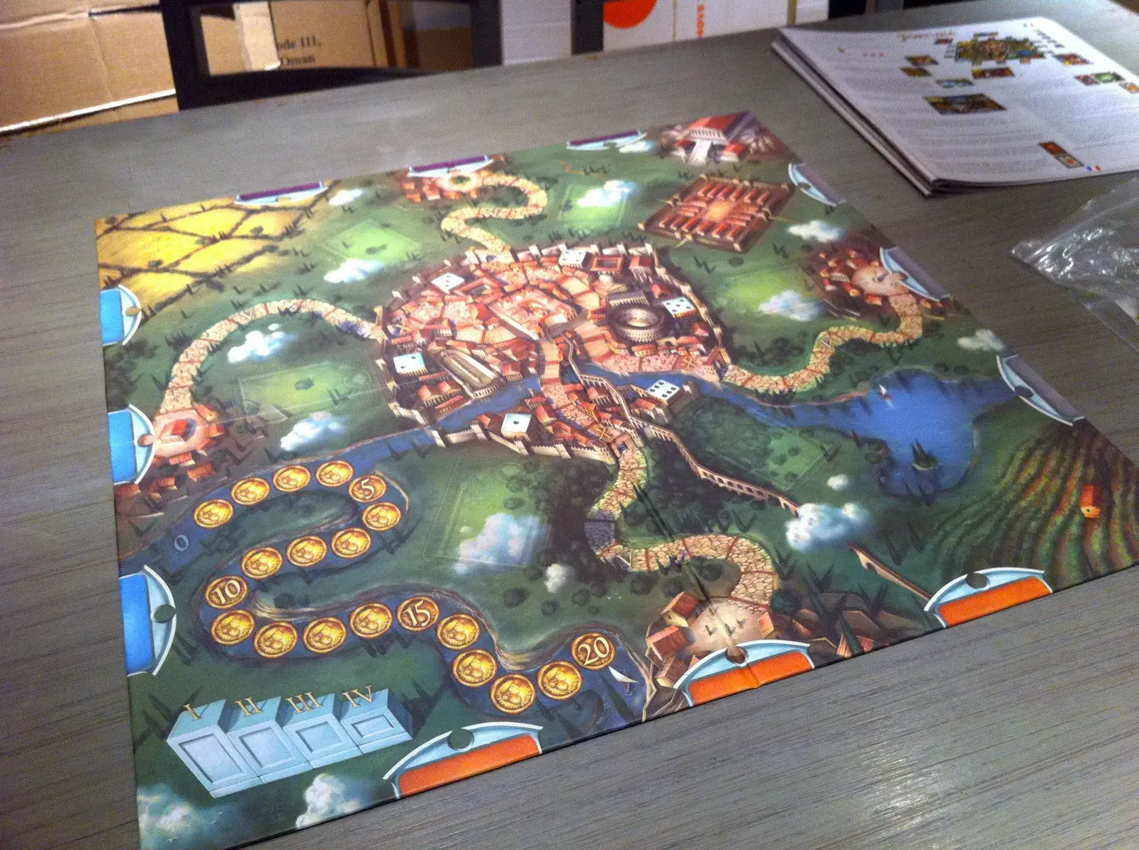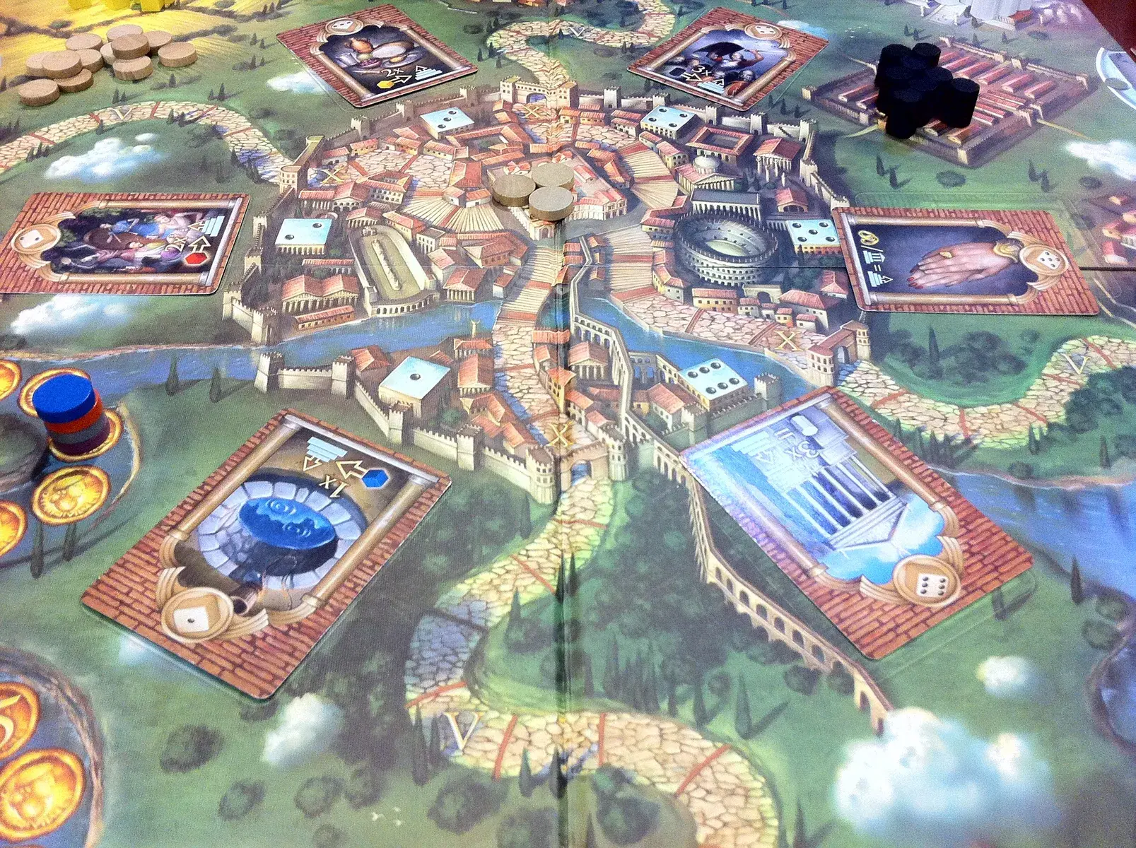 The player with the highest number of Victory Points at the end of the game wins. The game ends when one player gets to the Center of Rome (the Palace of the Emperor), then this final round is completed. Scoring in the game is partly based on the number of steps you have made towards Rome = each step is one VP. The other Victory Points are scored by collecting the right combination of privilege cards and resources. The VP scored with the privately held privilege cards stays a secret till the end of the game when the total scoring is revealed.