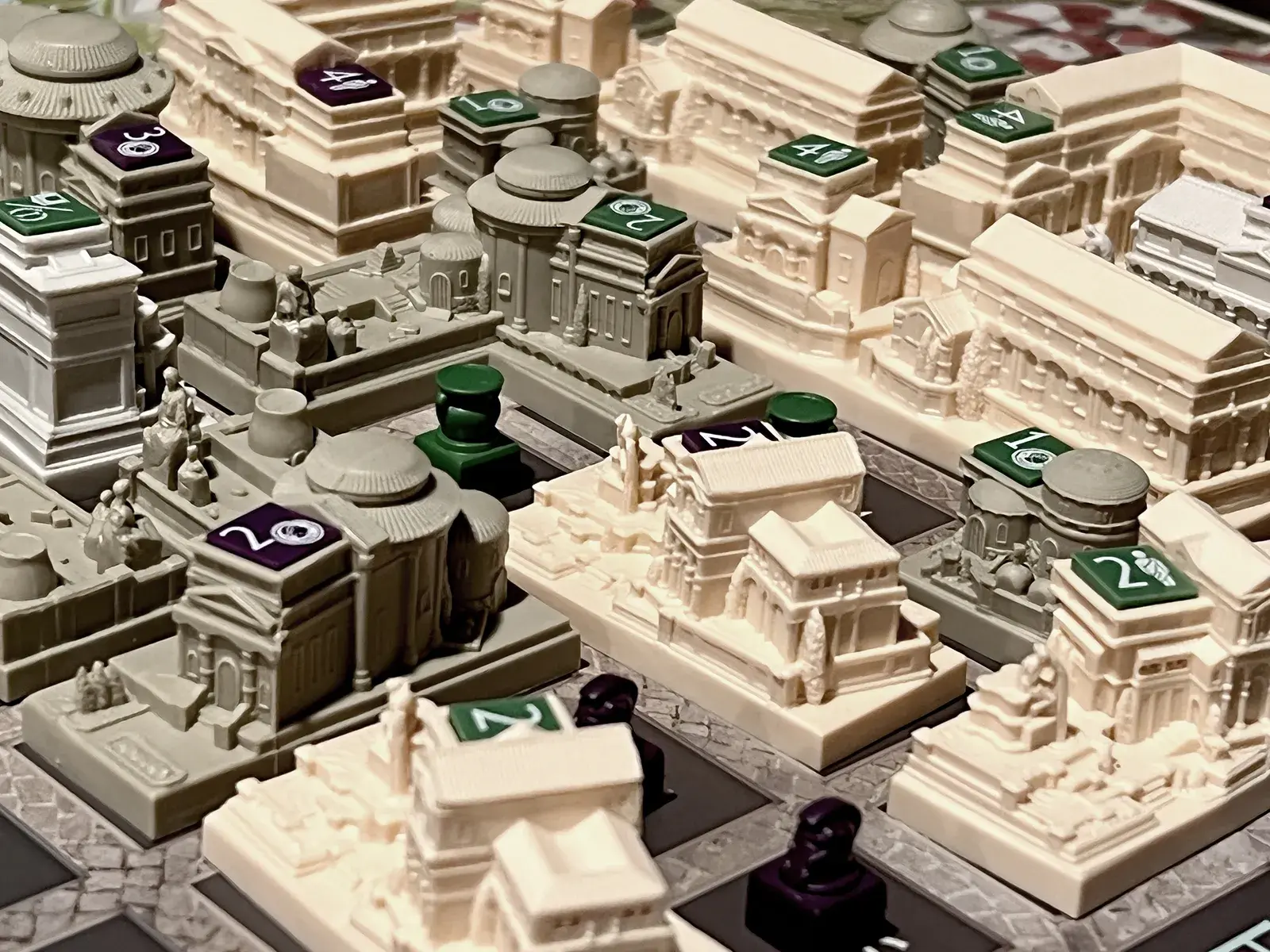 On a player's turn they select from purchasing a new lot, building a new building in the shared city of Rome, or collecting income!