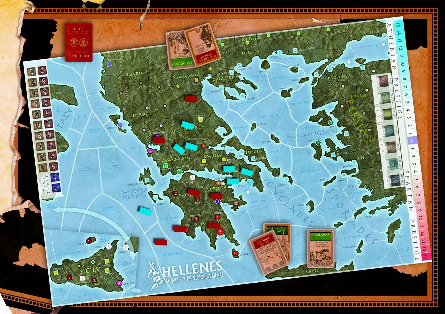 One player plays Sparta, the dominant land power of the era; the other plays Athens, the dominant sea power. Each side also seeks the allegiance of minor Greek city-states and barbarian tribes: some that persevere and others that come and go. Revolts, sieges, leaders, wintering, and civic discord all play important roles.