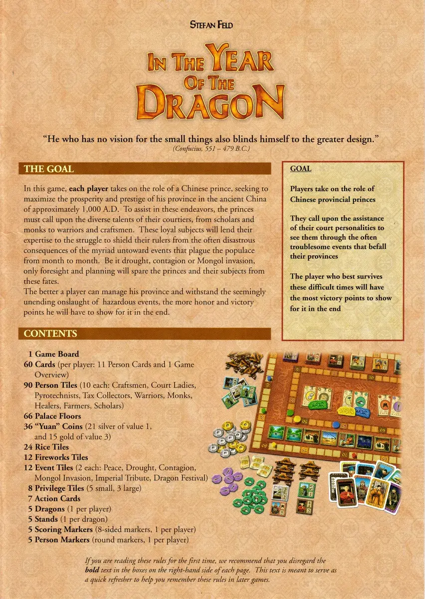 Players take on the role of Chinese rulers around the year 1000. The game plays out in twelve rounds, with each round representing one month in a year that seems to go from bad to worse. Disease, drought, and attacks from the Mongols may claim lives, but make sure you have enough money to offer a tribute to the Emperor.