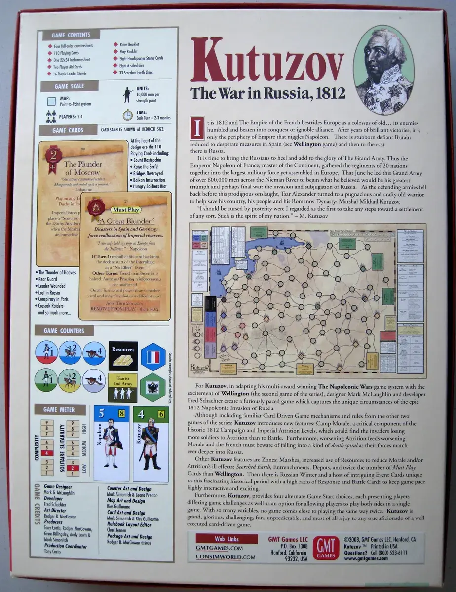 Kutuzov is an interactive, play it complete in one-sitting card-driven game of sweeping manoeuvres, epic battles, storied sieges, lethal attrition and crucial-to-win troop morale for one to four players from the designer of The Napoleonic Wars and Wellington.