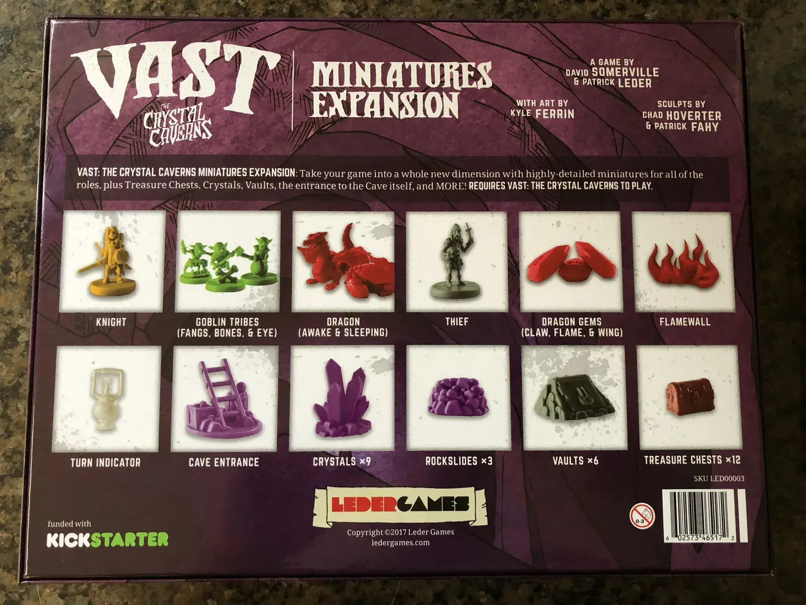• Contains all the miniatures for the game Vast: The Crystal Caverns except for the Ghoul, Ghost, and Unicorn, which are included in Vast: The Fearsome Foes. Empty slots are provided for these 3 miniatures in the insert of this expansion.