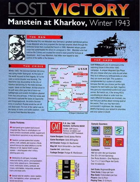 • Lost VictoryManstein at Kharkov, Winter 1943, puts you in command of the opposing forces in the winter 1943 campaign. A unique integrated Ops Phase lets you choose what your units do and when they do it without any artificial limits on when they can move and fight. This system is complemented by a system of combat bonuses that lets you choose just the right weapons for each battle you fight. Together, they give you unparalleled control over your armies. But watch out: if the wrong HQ is coordinating an attack or units from too many different formations are involved, you can find your perfect attack coming apart at the seams. Then you may face every commander's nightmare: the dreaded SNAFU that leaves your assault in shambles and your career in doubt.