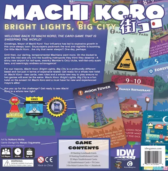 • You've done a great job as Mayor! Machi Koro: Bright Lights, Big City shows how popular Machi Koro has become! What started as a sleepy town of cheese factories and wheat fields has become a hot tourist destination!