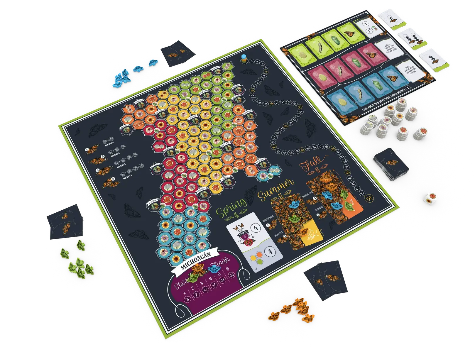Mariposas is played in three seasons. In general, your butterflies try to head north in spring, spread out in summer, and return south in fall. The end of each season brings a scoring round, and at the end of fall, the player with the most successful family of butterflies — i.e., the most victory points — wins the game.