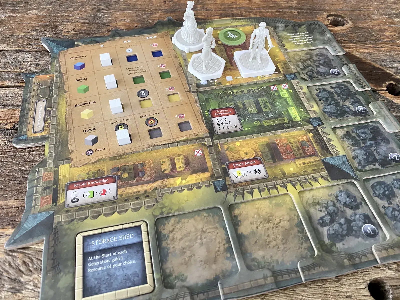 But they have to balance study and active experimentation because at the end of each generation, all of their experiments and resources are lost to time until their child begins again with only the "Journaled Knowledge and Estate" they have willed to them — and since the game is played over the course of three generations, it is inevitable that the players will rouse the townsfolk to form angry mobs or spiral into insanity from the ethically dubious works they have created. The player with the most points at the end of three generations wins and becomes the most revered, feared, ingenious scientist the world has ever known!