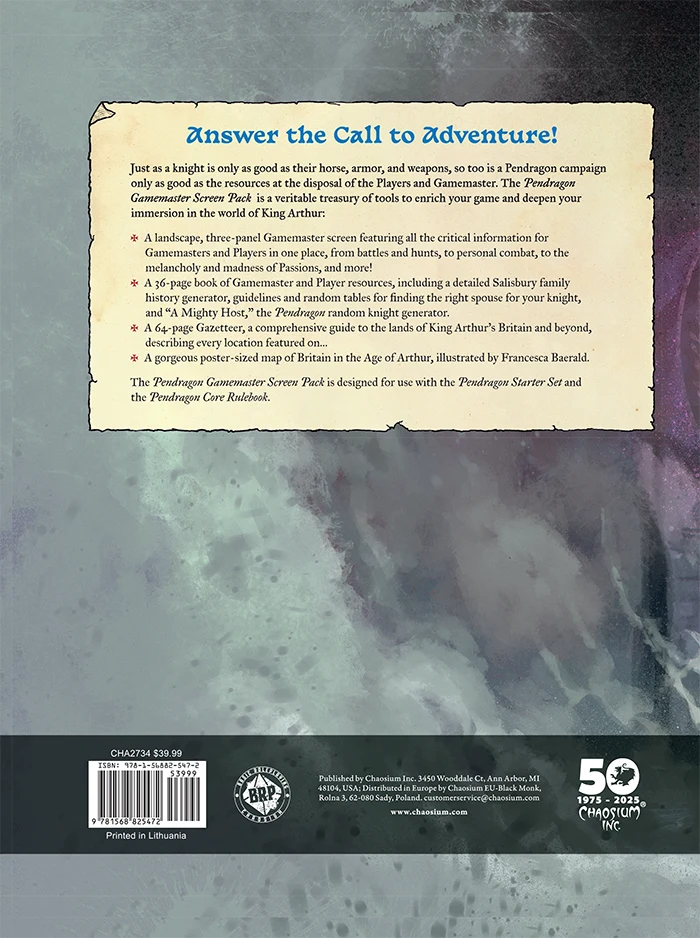 • The Pendragon: Gamemaster Screen Pack is a veritable treasury of tools to enrich your game and deepen your immersion in the world of King Arthur.