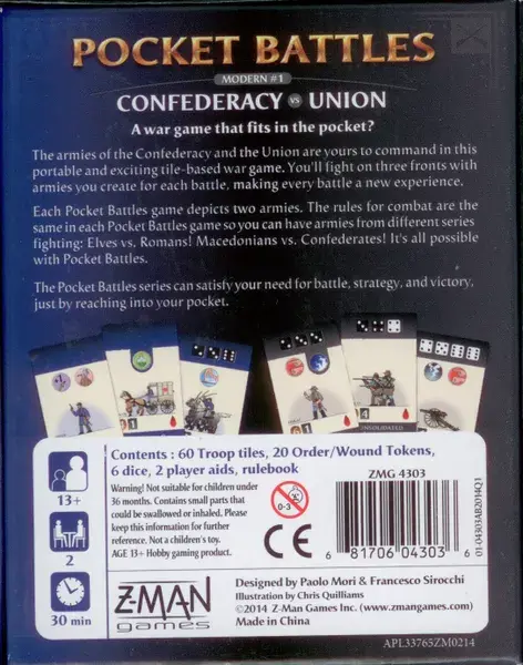 A war game that fits in the pocket! In Pocket Battles: Confederacy vs Union — the fourth title in the Pocket Battles series — tiles represent troops and troops make up units in your army; just determine the size of the battle, then create your own army from a pool of existing troops. Each tile hits on certain rolls, and some can only melee while others can shoot. Some tiles also have special traits that can affect their whole unit or army.