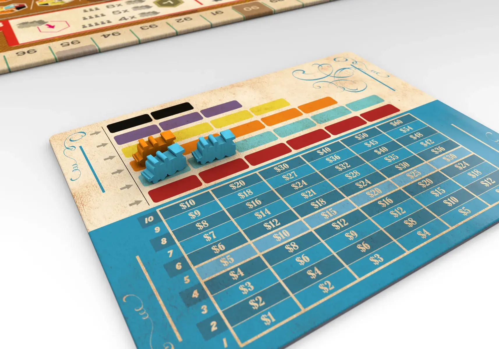 In Ride the Rails, you will invest in railroad companies, build railway track across the United States, and deliver passengers to as many cities as possible. Each round, a new railroad company is introduced to the game, and each railroad company has its own special placement rules! Deliver passengers to as many cities as possible to earn the most points. Be cautious in your travels as shareholders of railroads that you use will also earn points!
