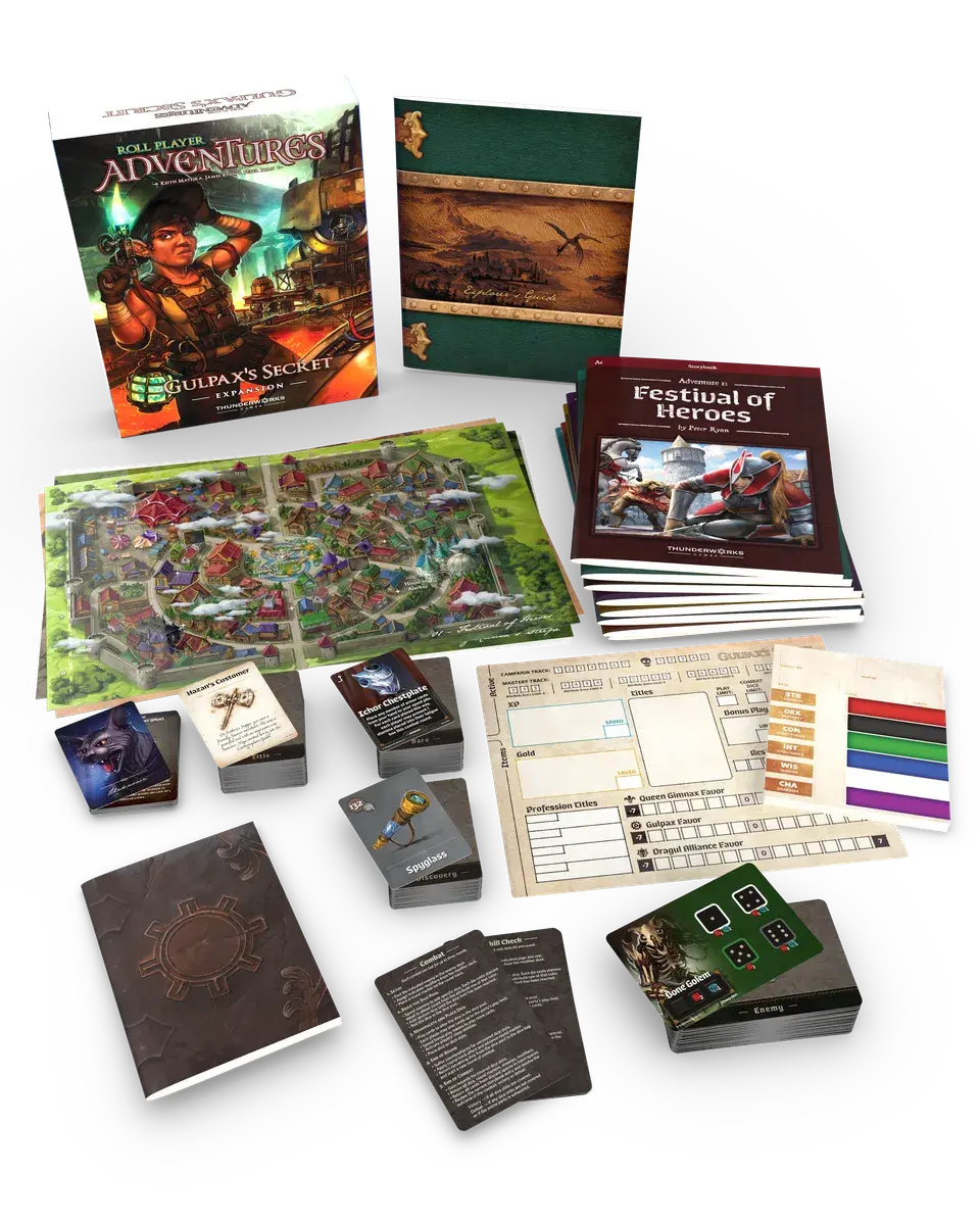 Gulpax’s Secret requires the Roll Player Adventures base game to play. Set off on a journey of peril and discovery with your hero! Pick from one of eighteen pre-generated characters provided, or a host of additional options from the thirty-six pre-generated characters in Roll Player Adventures base game. Or, play as any completed character from the hit game, Roll Player!