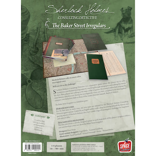 • Sherlock Holmes, Consulting Detective: Baker Street Irregulars is a cooperative game. Players try to solve mysteries by interviewing suspects, searching through newspapers, and walking the streets of London for clues. In Baker Street Irregular’s, ten brand new cases written by a British specialist of Sherlock Holmes, players embody the Irregulars, the young kids helping the most famous detective ever during his investigations.