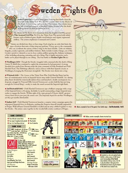 Sweden Fights On is a tactical battle game featuring four battles from the later half of the Thirty Years War. It is the second volume in the Musket & Pike Battle Series covering warfare in the 17th Century. This volume traces the fall, revival, and pinnacle of Swedish military fortunes after the death of King Gustav II Adolf at Lützen in 1632.