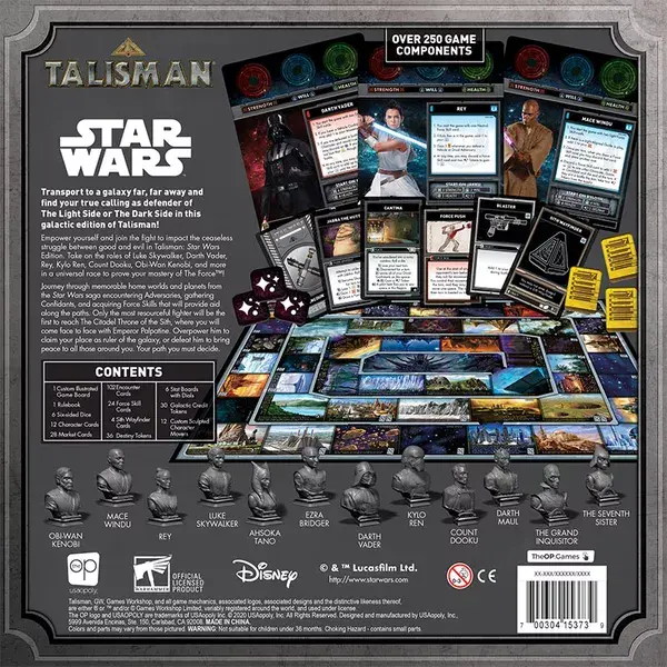 Adventurers can choose from twelve playable characters to charge their way into the inner rings of the galactic game board. Luke Skywalker, Darth Vader, Rey, Kylo Ren, Count Dooku, and Obi-Wan Kenobi are among the custom-sculpted game pieces true to every beloved Talisman game.