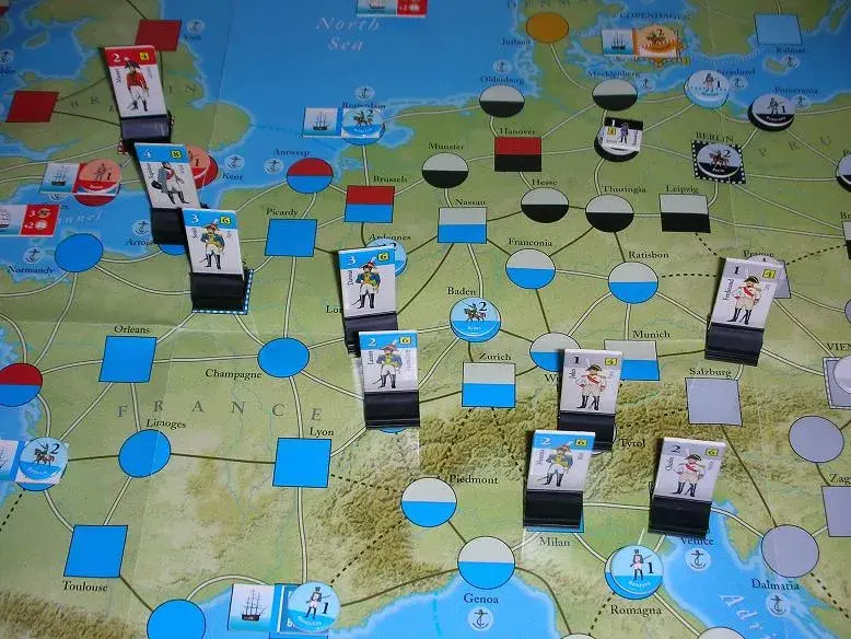 Like similar card-driven games, The Napoleonic Wars provides strategy cards that are played as events or to activate leaders, armies or fleets (by play of command points) to move on the map. Players must constantly weight the value of an event or reaction card against the need for its command points. Command points themselves can be played for a wide variety of activities, making play unpredictable and fresh with each sitting. Uncontrolled powers are governed by a diplomatic track which is also affected by play of command points and events.