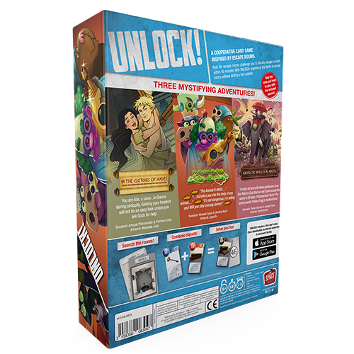 • UNLOCK! Mythic Adventures is a cooperative card game inspired by escape rooms. Across three new scenarios, players search rooms, combine objects, and solve puzzles. Explore Mythic Greece in the “In the clutches of Hades” adventure! Experience “Professor Noside’s Animal-O-Matic” for an unforgettable adventure. Finally, travel “Around the world in 80 minutes” in a grand adventure inspired by Jules Verne’s famous book.