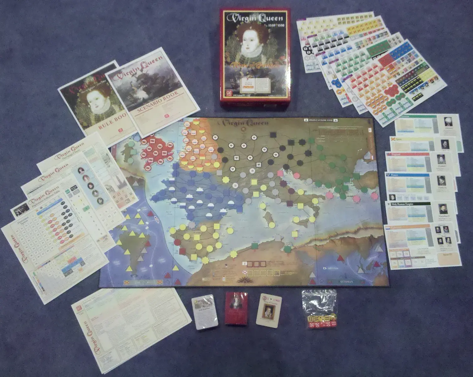 • Virgin Queen: Wars of Religion 1559-1598 is a game of grand strategy for two to six players based on the military, political and religious conflicts within Europe during the reigns of Elizabeth I of England and Philip II of Spain. Each player controls one or more of the major powers that presided over European politics in that day. Spain is the juggernaut, able to draw upon the vast riches of their global empire. But such a dominant power is sure to have many enemies. The Ottoman expansion towards Spain's Mediterranean outposts remains unchecked. Elizabeth's English sea dogs are poised to raid Spain's overseas empire. And the forces of Protestant reform will soon drag Spain into eighty years of rebellion in the Netherlands. Will Spain find aid from its Catholic allies? Perhaps not from France, where the Catholic Valois dynasty is soon to engage another group of Protestant believers in the bloody French Wars of Religion. And even Philip's relatives in Vienna who rule the Holy Roman Empire may dabble in the Protestant faith instead of remaining loyal to their Catholic heritage and Spanish brethren.