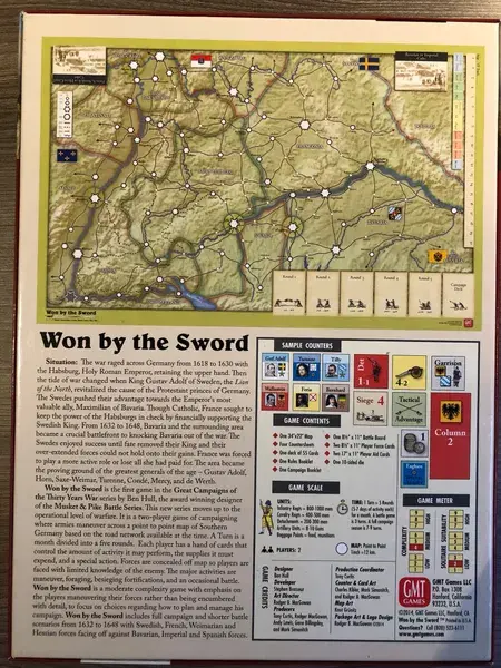 Won by the Sword is the first game in Ben Hull's Great Campaigns of the Thirty Years War series. It is a two-player game of operational warfare in the 17th Century. Armies maneuver on a point to point map of Southern Germany based on the road network available at the time. Each game is centered around a major battle or full campaign season. A Turn is a month divided into a variable number of impulses. Each army has a hand of Campaign Cards that control the amount of activity it may perform, the supplies it must expend, and a special action. Each impulse features one card play per army. Forces are concealed off map so players are faced with limited knowledge of the enemy. The major activities are maneuver, foraging, besieging fortifications, and an occasional battle. Won by the Sword is a low-complexity game with emphasis on the players maneuvering their forces, but many decisions await. The low rules complexity allows each player, rather than being encumbered with rules, to focus on choices regarding how to manage his campaign.
